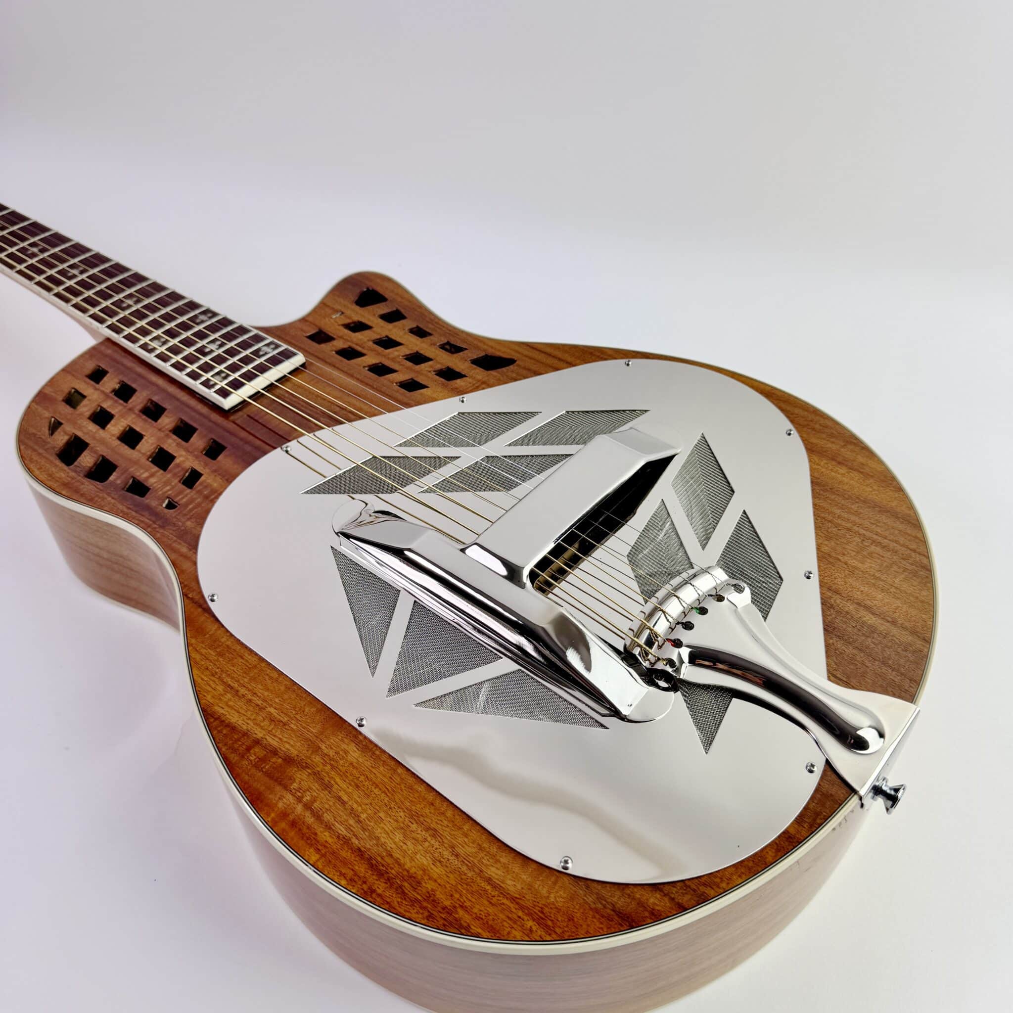 This is a great sounding biscuit resonator. Mine has a Schatten transducer. Acoustically it is banjo-ish, old school and the look really attracts attention. I added a Lace Sensor and another microphone type pickup and an extra jack. It is a tremendous instrument and great value. Form fit case is great too, light and tough!