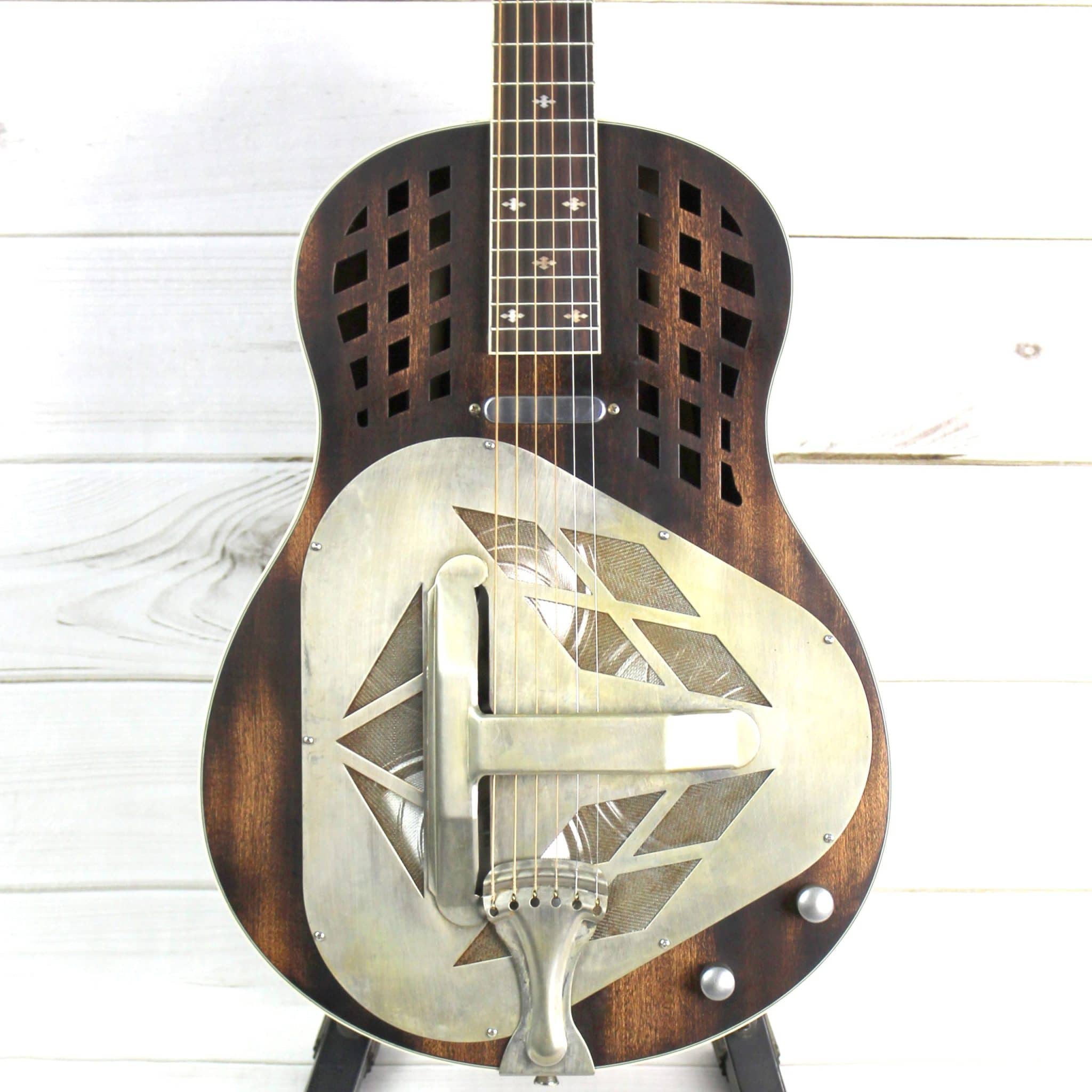 This is a great sounding biscuit resonator. Mine has a Schatten transducer. Acoustically it is banjo-ish, old school and the look really attracts attention. I added a Lace Sensor and another microphone type pickup and an extra jack. It is a tremendous instrument and great value. Form fit case is great too, light and tough!