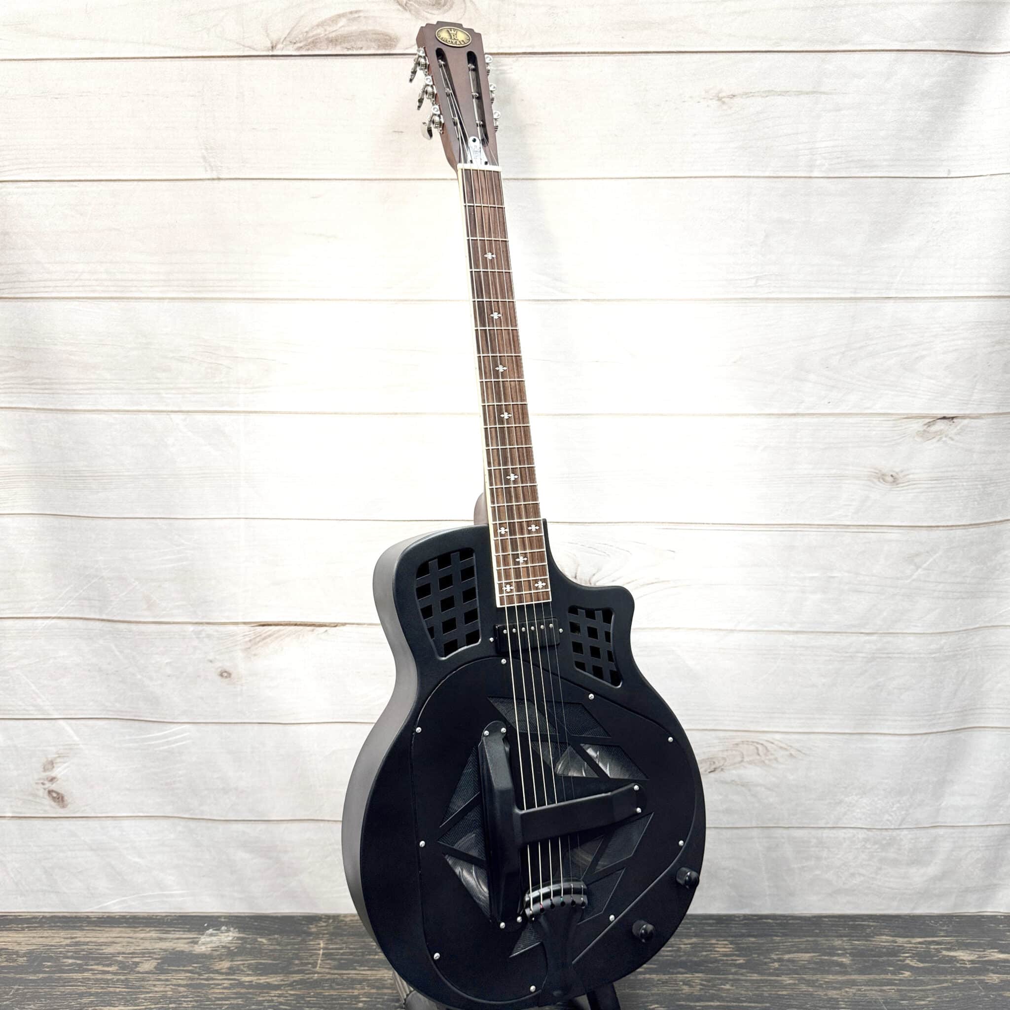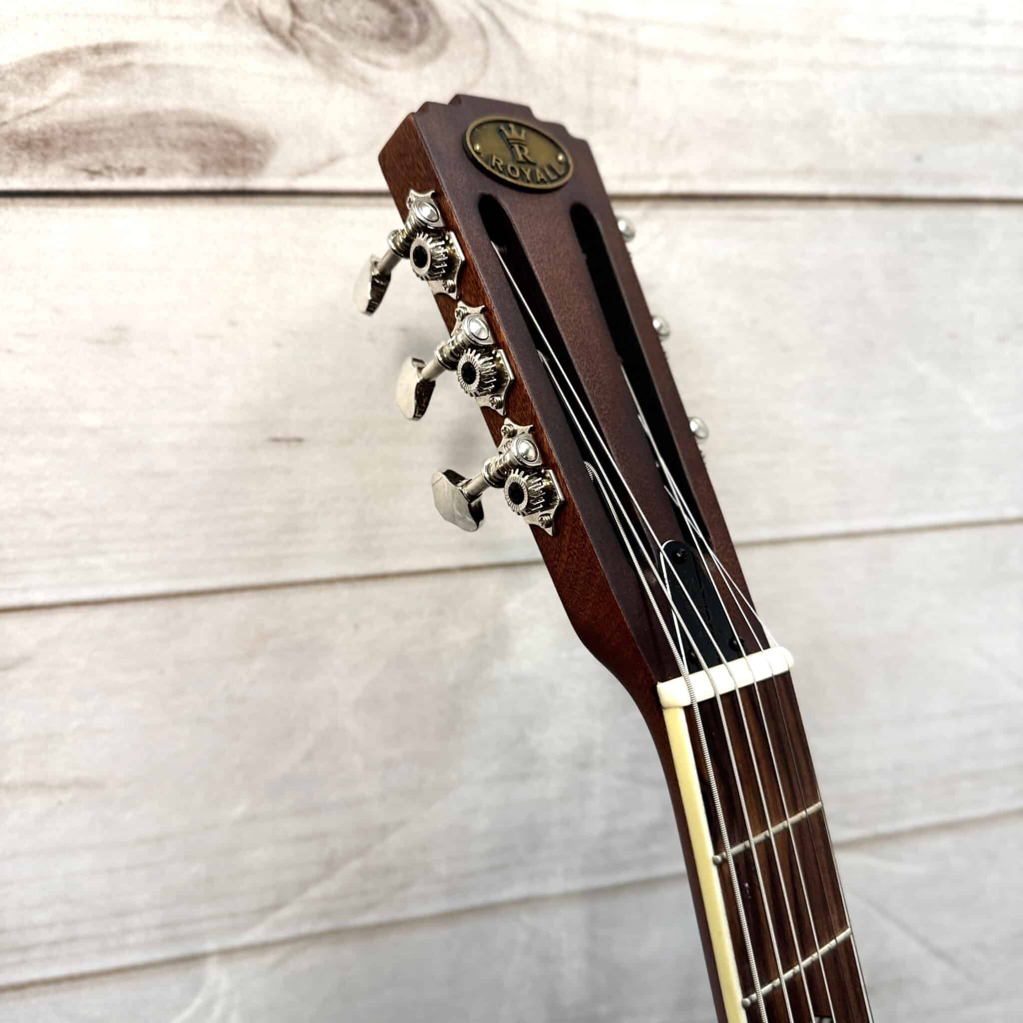 The Trifecta is our 14 fret tricone model in the Royall Resonator family. Based on the classic National Style 1, it has that distinctive tricone sustain and creamy tone. All of our resonators go through a 20 point inspection by our skilled guitar techs before shipment. After inspection, and or adjustment, we double polish the frets, condition the fingerboard, stretch the strings, and tune to pitch. Giving you a wonderfully smooth action and playability right out of the box.