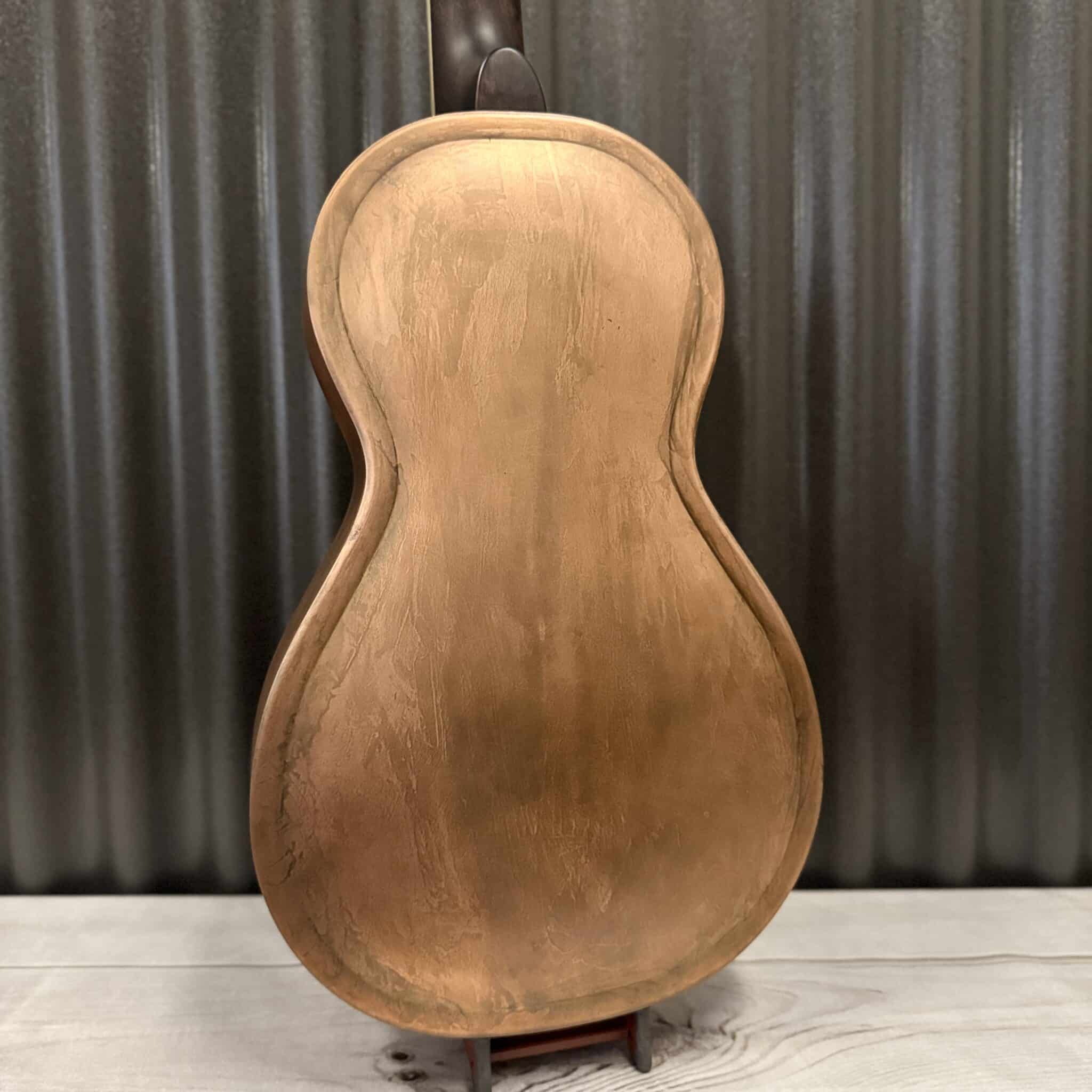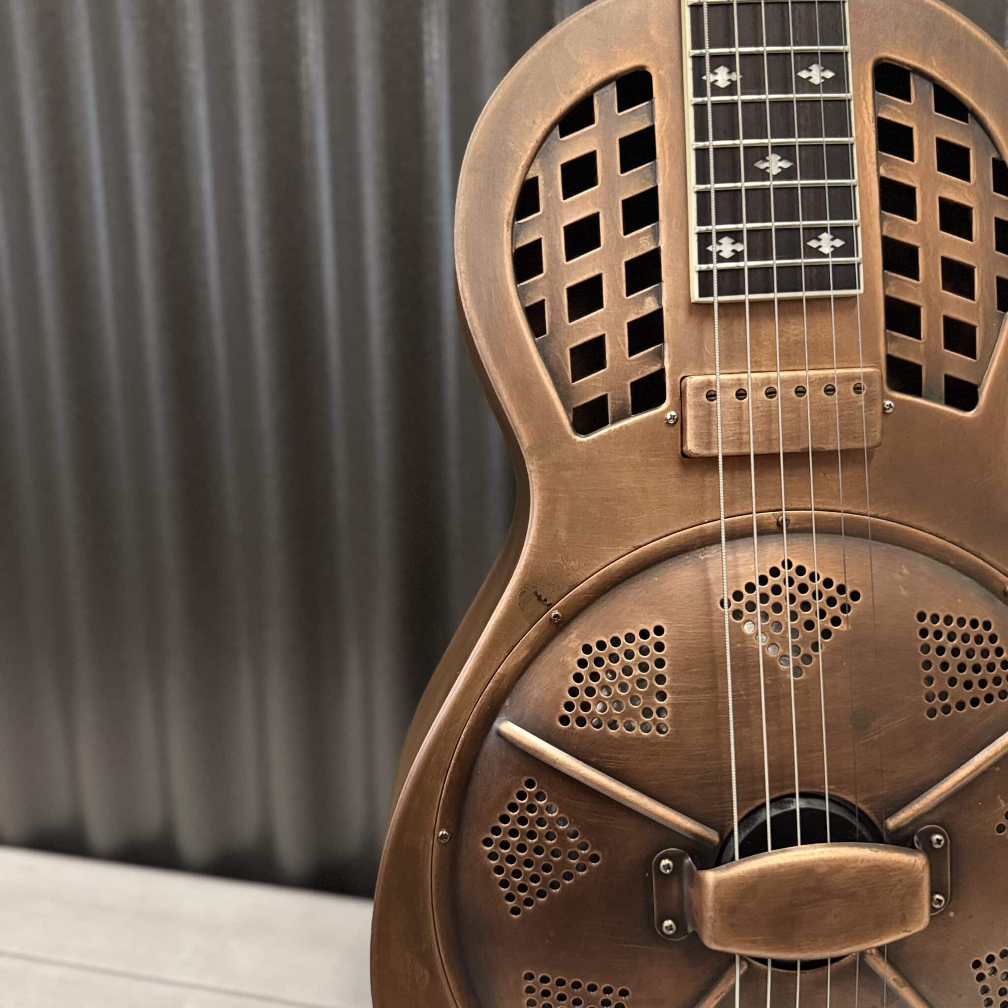 The Parlorizer is the parlor sized metal body resonator in our Royall Resonator family. This one is our new aged brushed Brass body single cone resonator with biscuit bridge, classic diamond pattern resonator cover and grid or lattice pattern sound holes like a traditional tricone. We think they’re pretty cool. Now with our new “Jester” Minihumbucker Pickup, they have extra warmth and punch when you plug in.