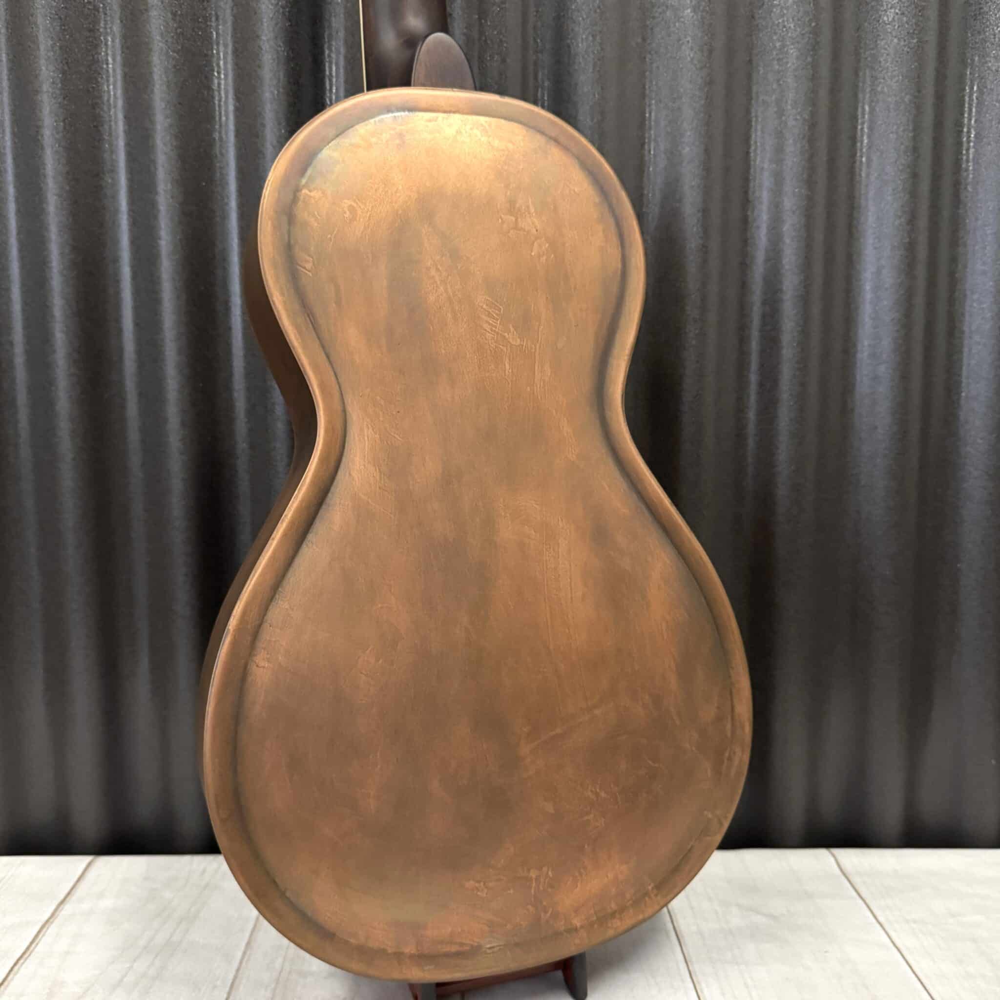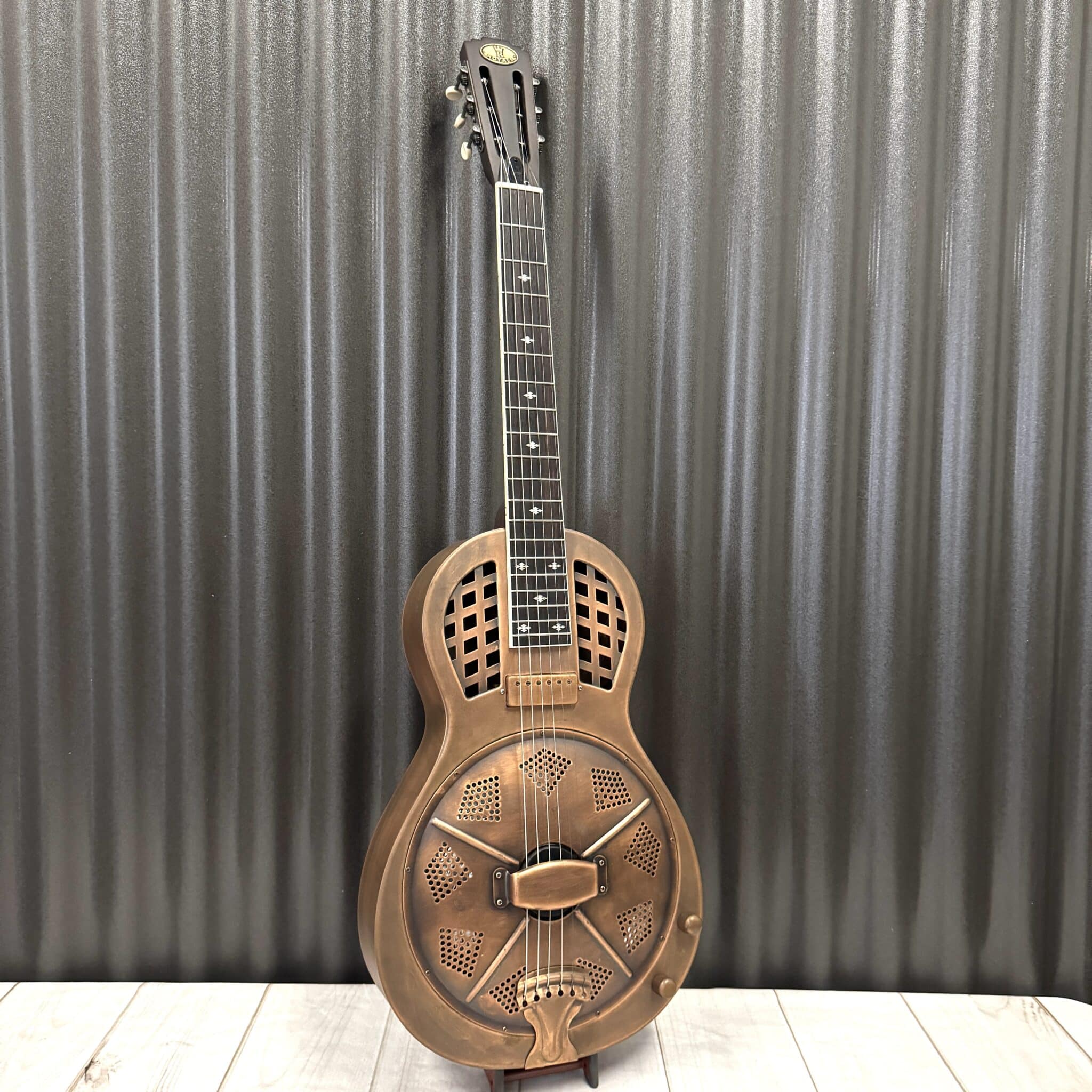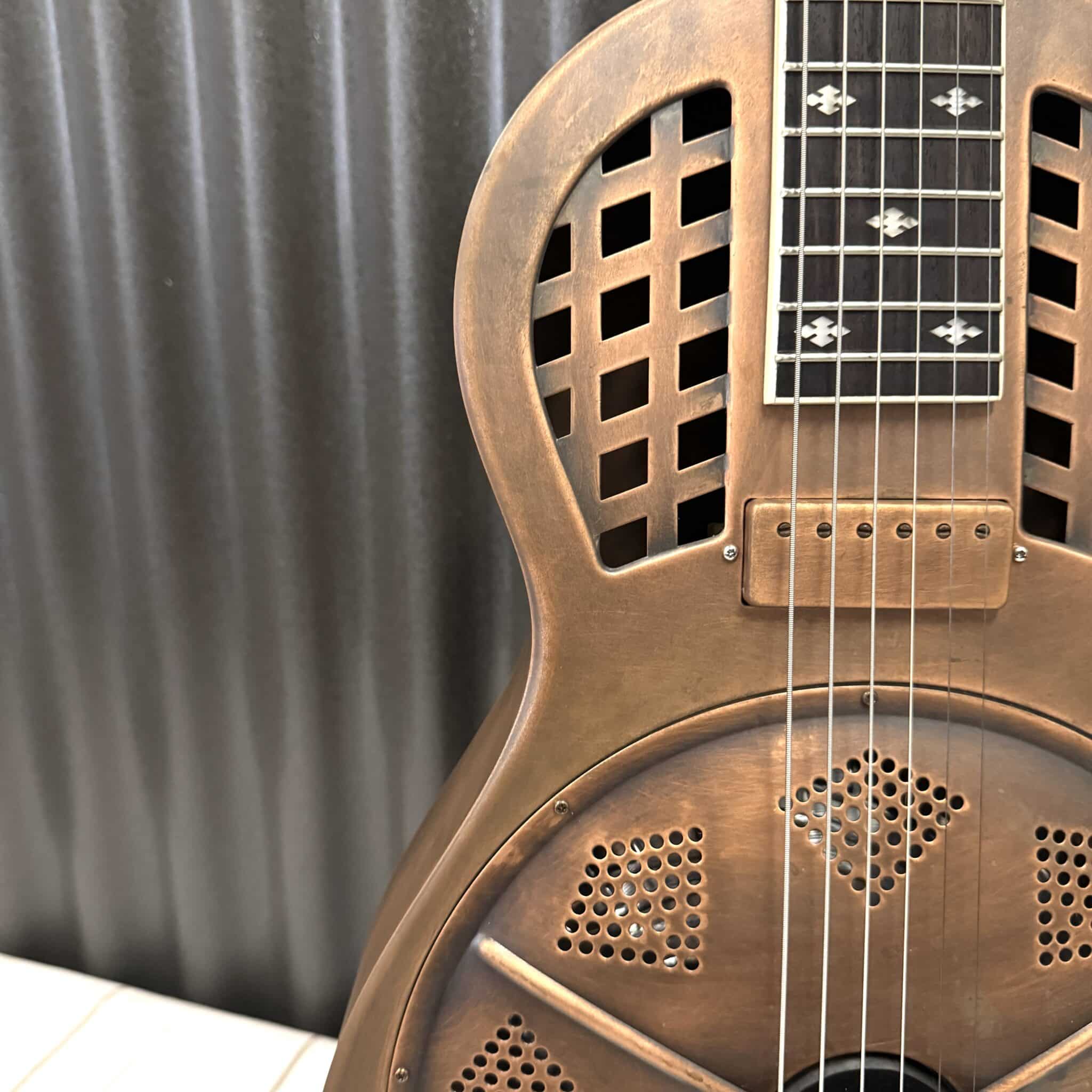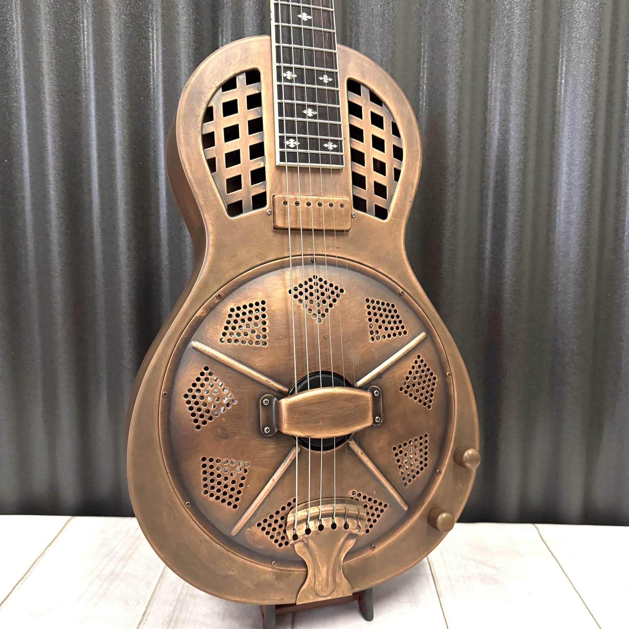 The Parlorizer is the parlor sized metal body resonator in our Royall Resonator family. This one is our new aged brushed Brass body single cone resonator with biscuit bridge, classic diamond pattern resonator cover and grid or lattice pattern sound holes like a traditional tricone. We think they’re pretty cool. Now with our new “Jester” Minihumbucker Pickup, they have extra warmth and punch when you plug in.